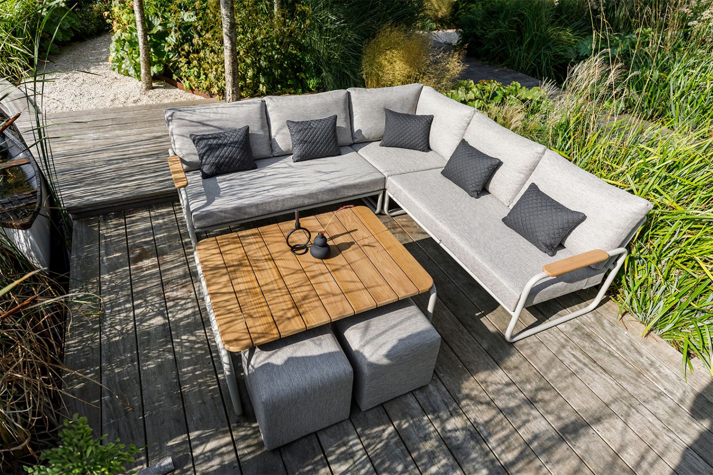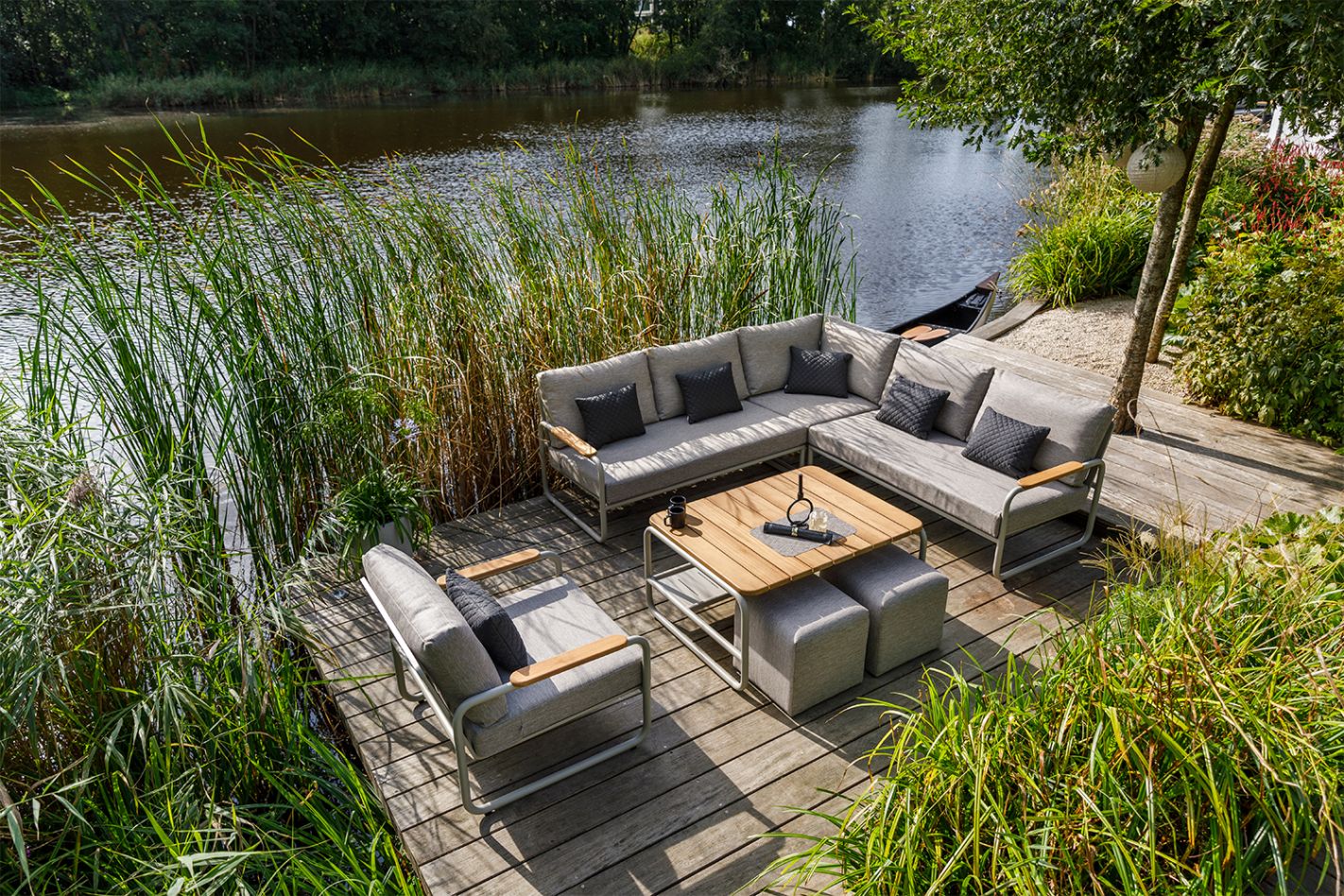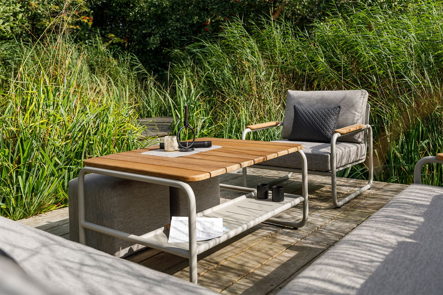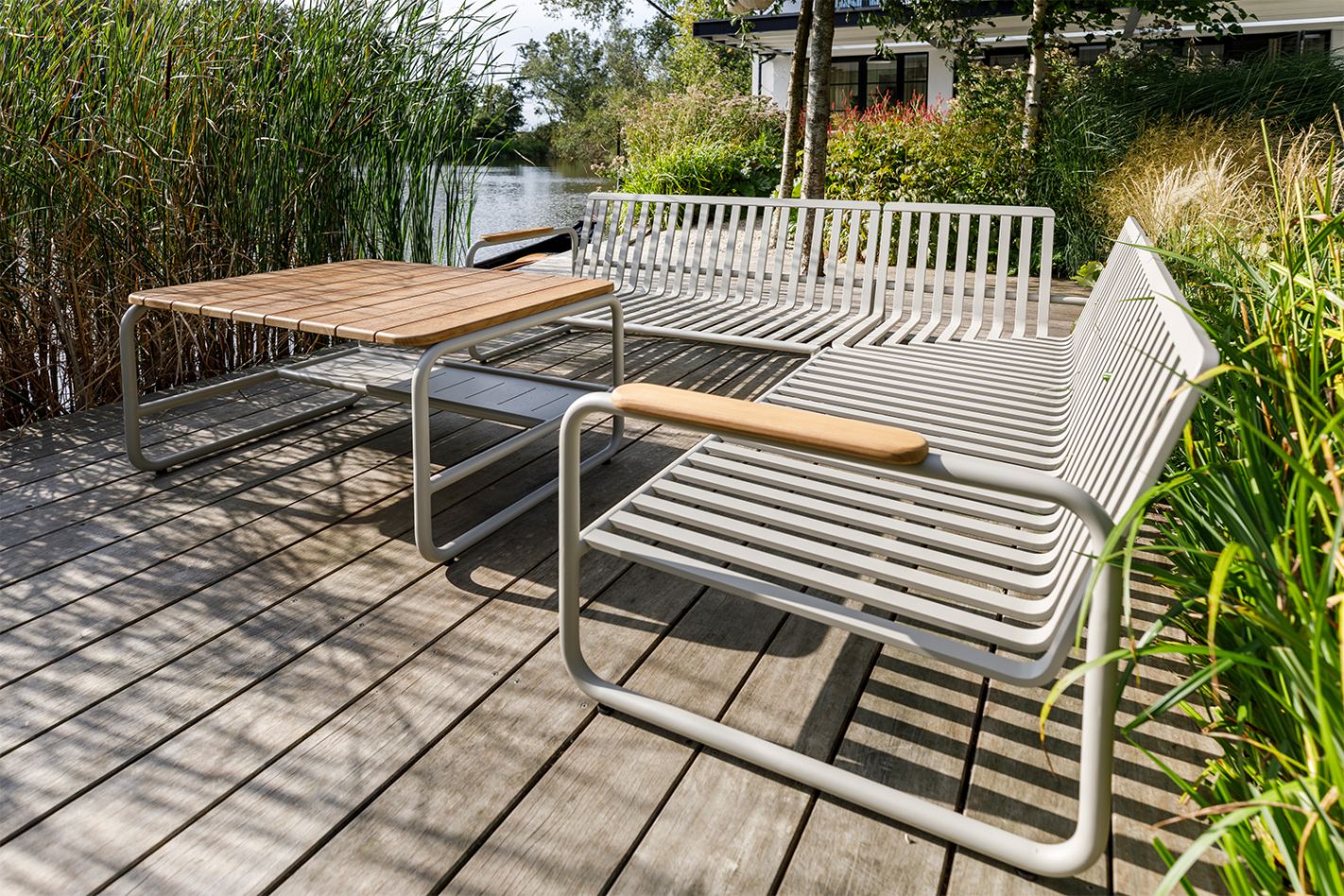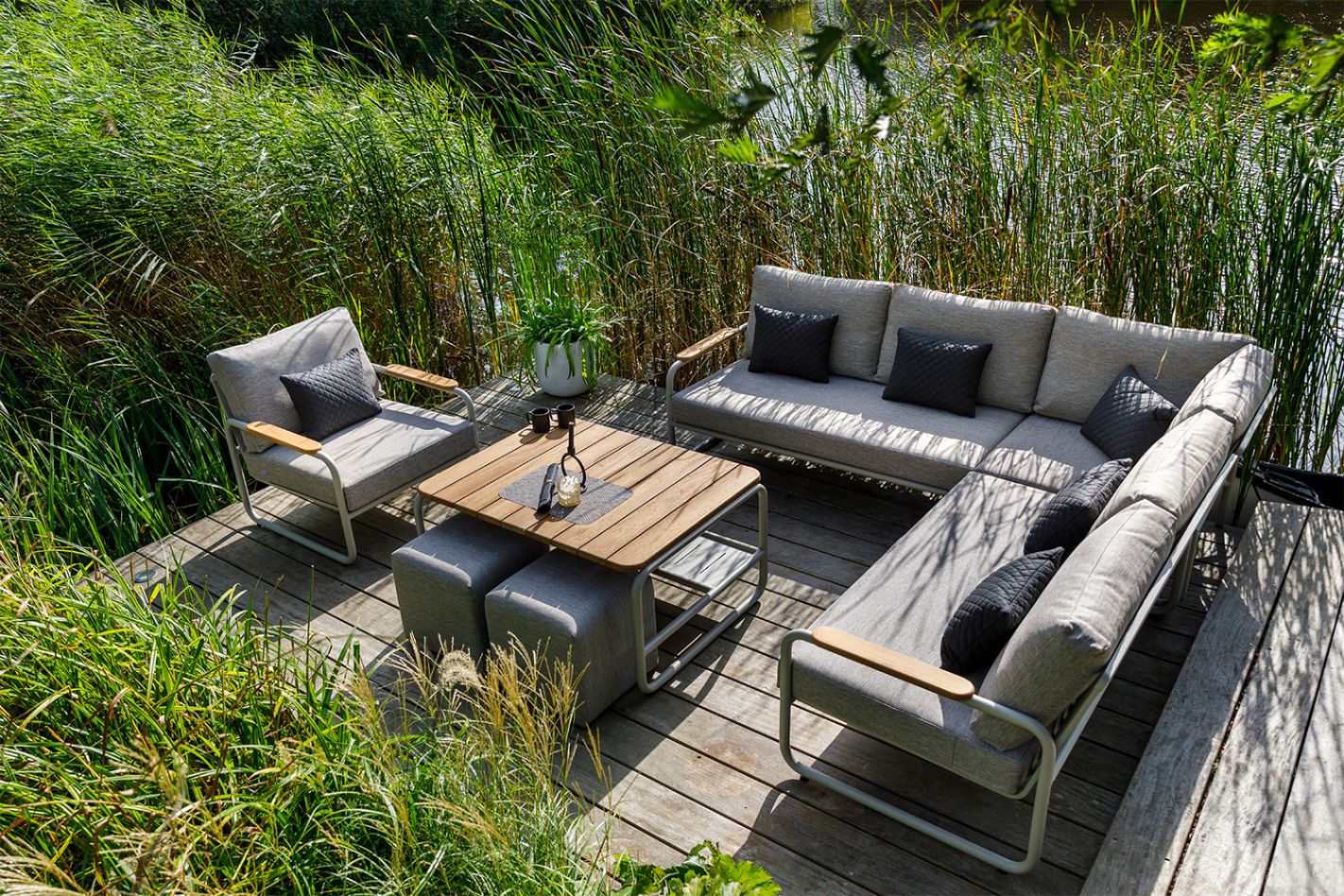 Organic aluminum lounge set with teak details. Ergonomic seating and a high coffee table (lounge/dining).
