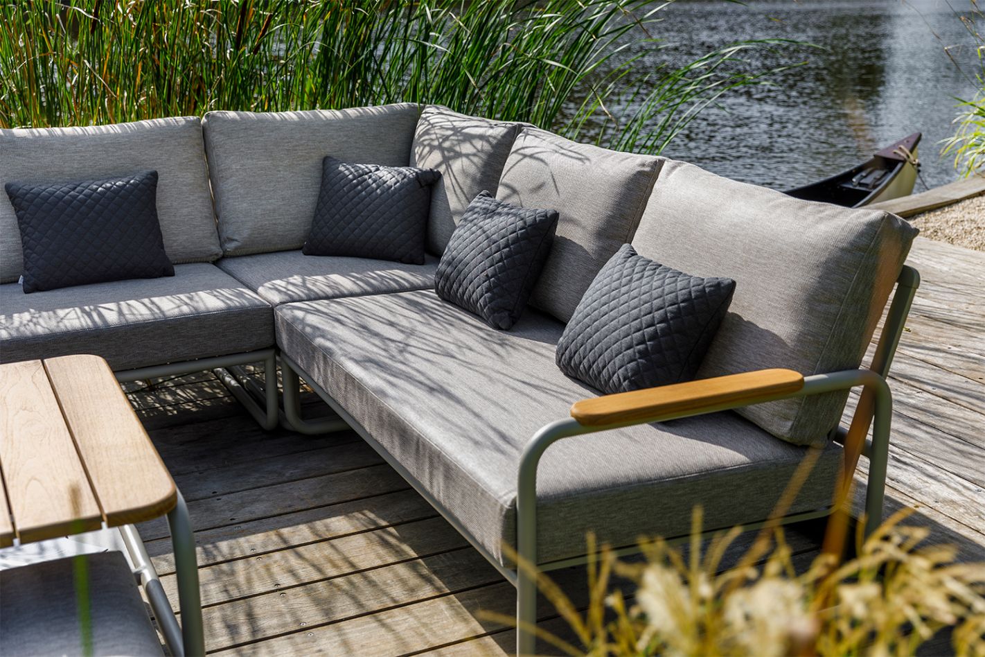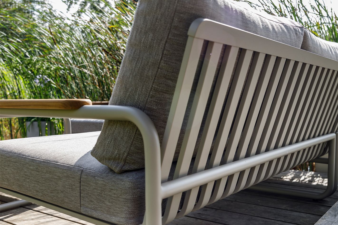 The Molino features wide, rounded armrests with teak details, which contribute to the luxurious and refined character of the set. The matching Molino coffee table is deliberately designed to be slightly taller, making this set perfect for both lounge and dining. Tip: The table is designed so that two ottomans can be slid underneath. Ideal for quickly creating extra seating when needed.