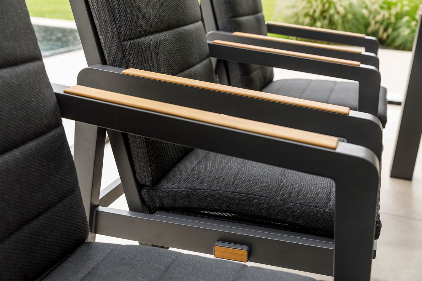 The Cortez garden chair's armrests are made of teak, which not only provides a luxurious finish but also extra comfort when resting on the back. The armrests are slightly rounded, while the sleek aluminum frame provides a modern look with a sturdy base.