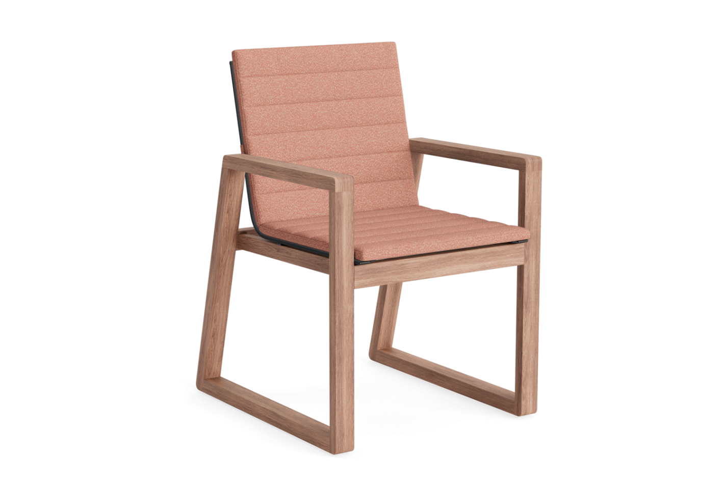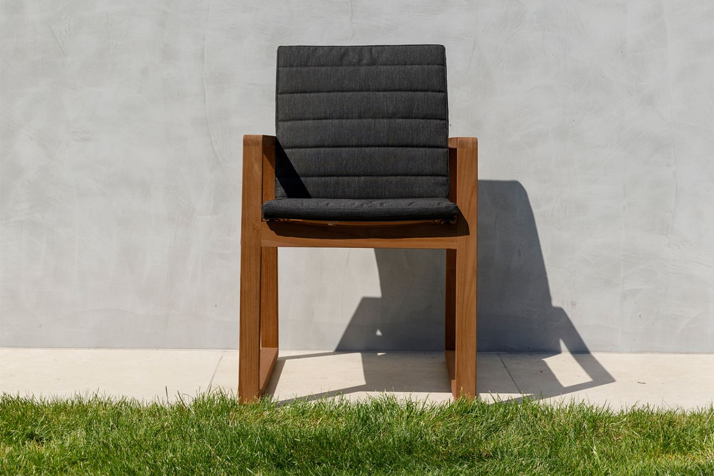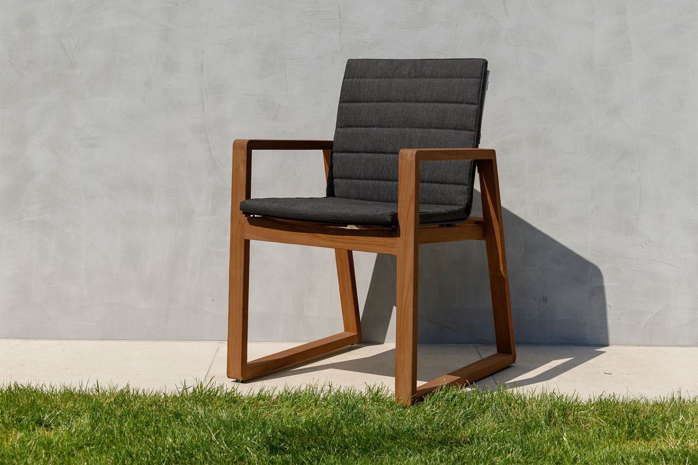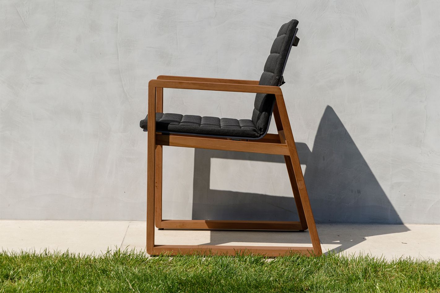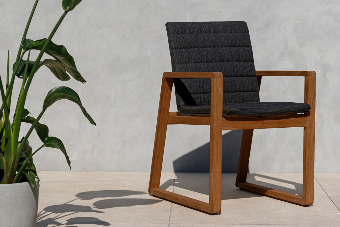 Sleek, minimalist teak garden chair with a sling seat (textilene) for immediate comfort without a cushion.