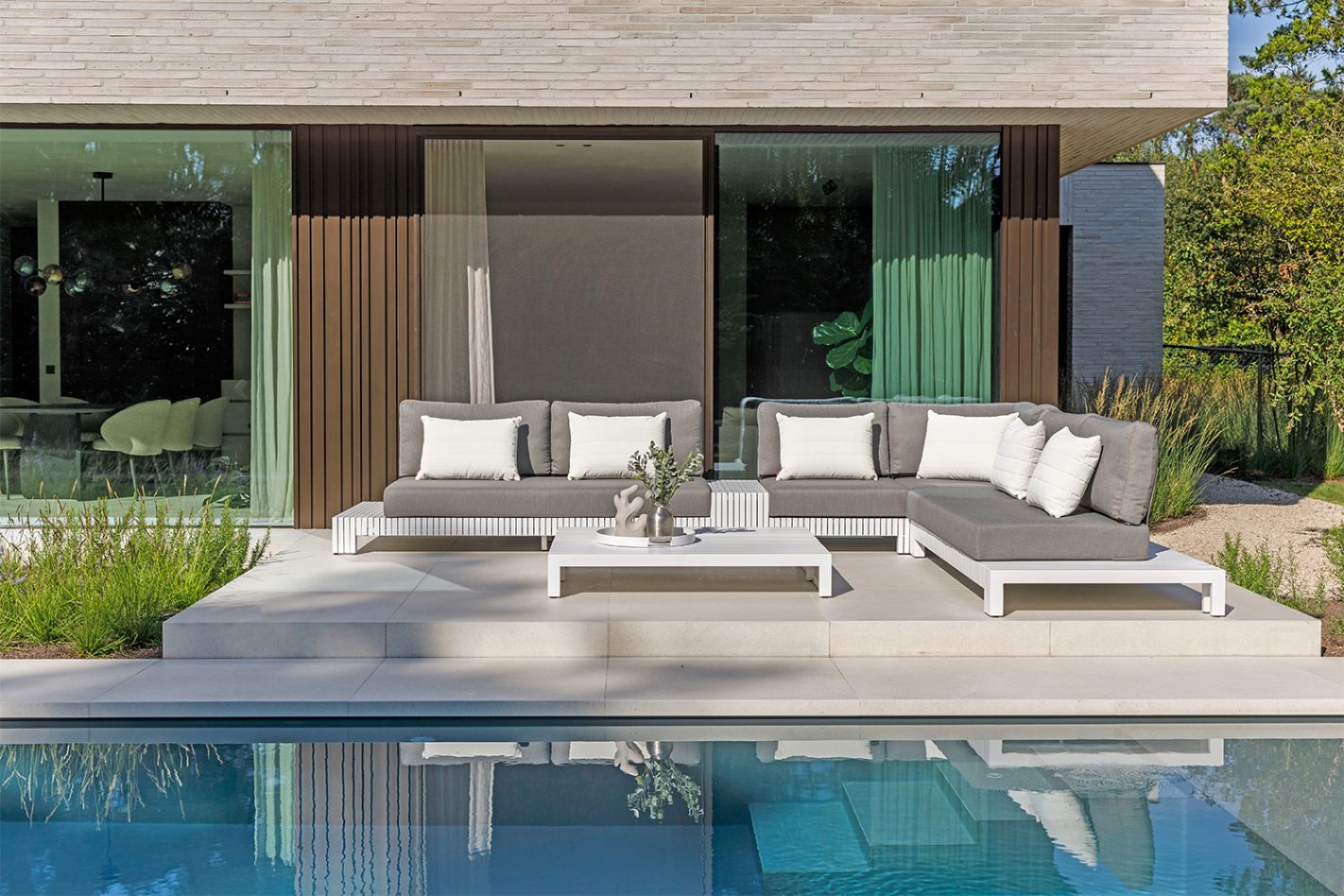 The Zagros lounge set is specially designed as the ideal poolside set. Its elongated and spacious design makes it a perfect fit for the water, allowing you to relax in a stylish and modern setting. The Zagros is available exclusively in white, which not only provides a fresh look but also perfectly complements a luxurious poolside environment.