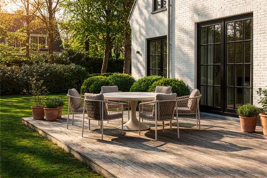 De Como tuinset speelt in op de trend van nu met het ronde tafelblad en verfijnd touw, wat zorgt voor een warme en moderne uitstraling.