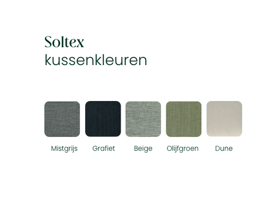 Genieten van het comfort van textiel met de duurzaamheid van synthetische materialen? All-weather Soltex kussens bieden precies dat! All-weather Soltex is een hoogwaardige mix van een sterke polyester draad en een zachte olefin draad. Dit zorgt voor een natuurlijke uitstraling én prettig zitcomfort. De stof is stevig geweven en waterdoorlatend, onderhoudsvriendelijk en goed bestand tegen vuil, schimmel en verkleuring.