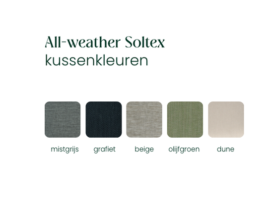 All-weather Soltex is ideaal voor wie in de lente en zomer veel buiten leeft, maar geen moeite heeft om kussens bij slechter weer even op te bergen. Deze kussens kunnen van maart tot en met oktober prima buiten blijven liggen. Zit je graag buiten, houd je van een zachte, luxe uitstraling en wil je een tuin die er altijd mooi aangekleed bij ligt? Dan is All-weather Soltex een uitstekende keuze.
