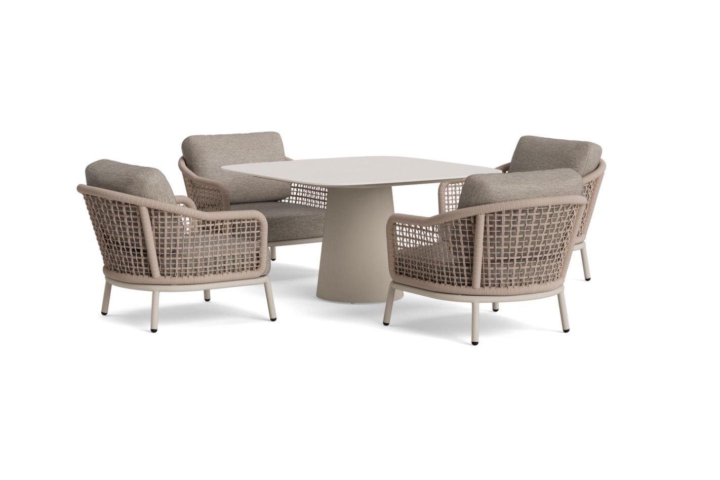 Het middelpunt van de set is de vierkante tafel met afgeronde hoeken en een kolompoot in het midden. Deze centrale poot geeft een rustige, elegante uitstraling. De zachte belijning van het tafelblad versterkt het toegankelijke karakter van de set en brengt balans in je buitenruimte.
