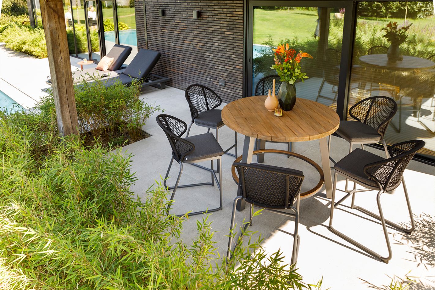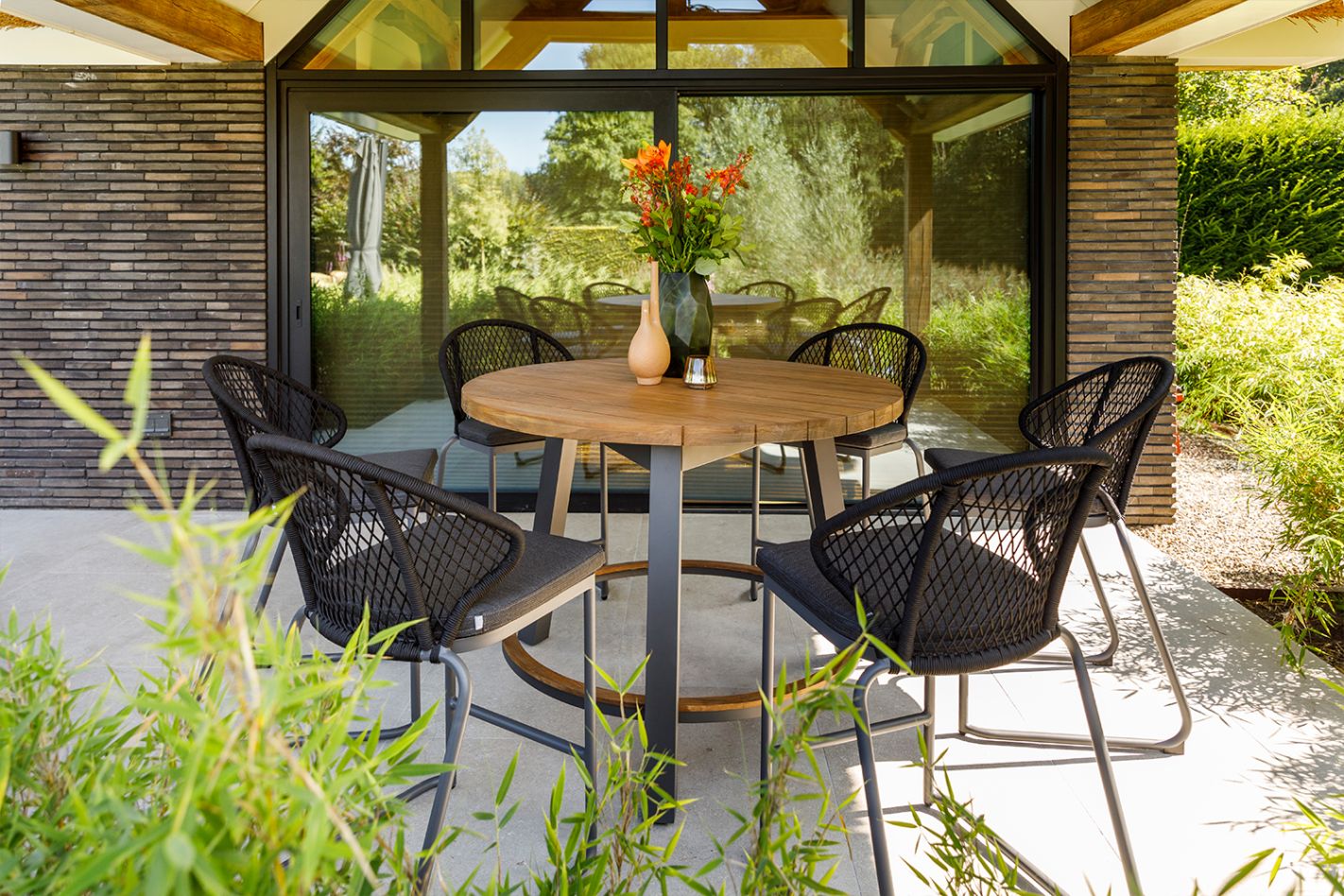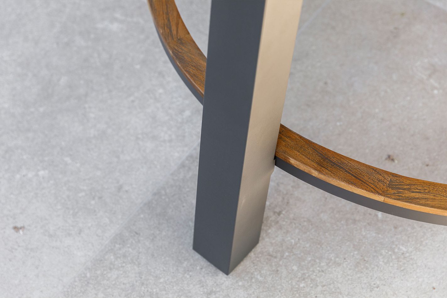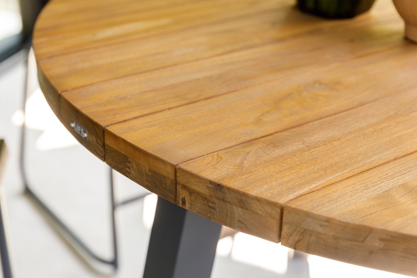 Het stevige aluminium frame heeft rechte hoeken en biedt een solide basis voor langdurig gebruik. Het ronde tafelblad is verkrijgbaar in robuust teak of grey teak, beide bieden een natuurlijke en luxe uitstraling. De combinatie van aluminium en teak zorgt voor een sterke, weerbestendige tafel die bestand is tegen diverse weersomstandigheden.