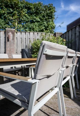 De stijl van hun interieur loopt door in de tuin: modern met een zachte, warme basis. “Binnen werken we ook met veel beige en rustige tinten, dus het voelt logisch dat we dat buiten doortrekken,” vertelt Britt. “De beige kleur van de set is neutraal, maar helemaal van nu. En het teak zorgt voor een levendig contrast zonder dat het te druk wordt.”