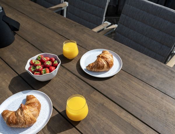 De basis voor de buitenruimte van Britt en Niels? Een tuinset in beige aluminium, gecombineerd met een teakhouten tafelblad. Ze kozen voor een Mixx tuintafel met een beige aluminium frame en een robuust teakhouten blad, gecombineerd met bijpassende Soho tuinstoelen in beige aluminium.