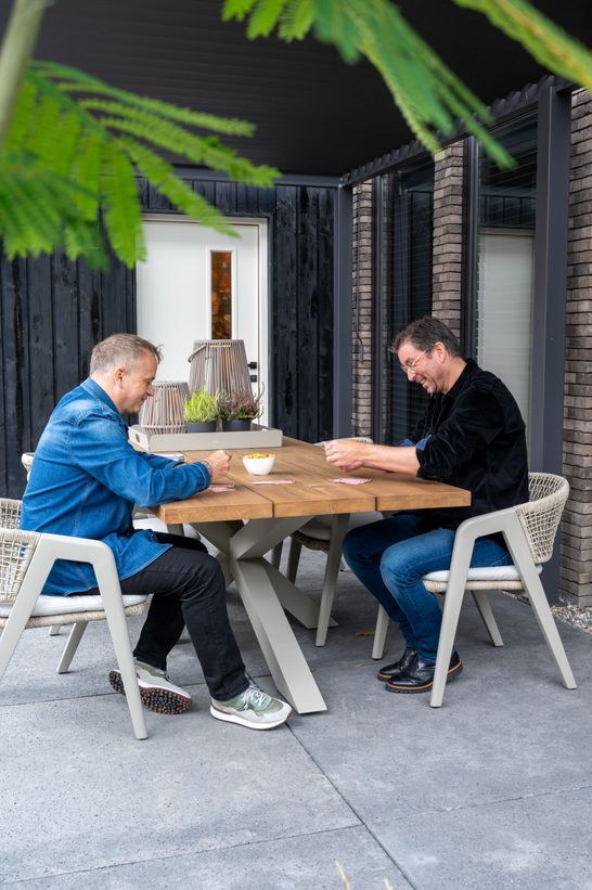 Onder de aluminium overkapping staat de Cross tuintafel met robuust teakhouten blad en kruispoot, omringd door zes Fitz Roy tuinstoelen in beige aluminium met gevlochten rug. "We houden van lekker tafelen met vrienden en familie," zegt Bert. "Een grote tafel en fijne stoelen waren dus belangrijk."