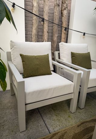 Voor het loungegedeelte kozen ze de Timber loungeset, met een 3-zitsbank en twee losse loungestoelen in beige aluminium.