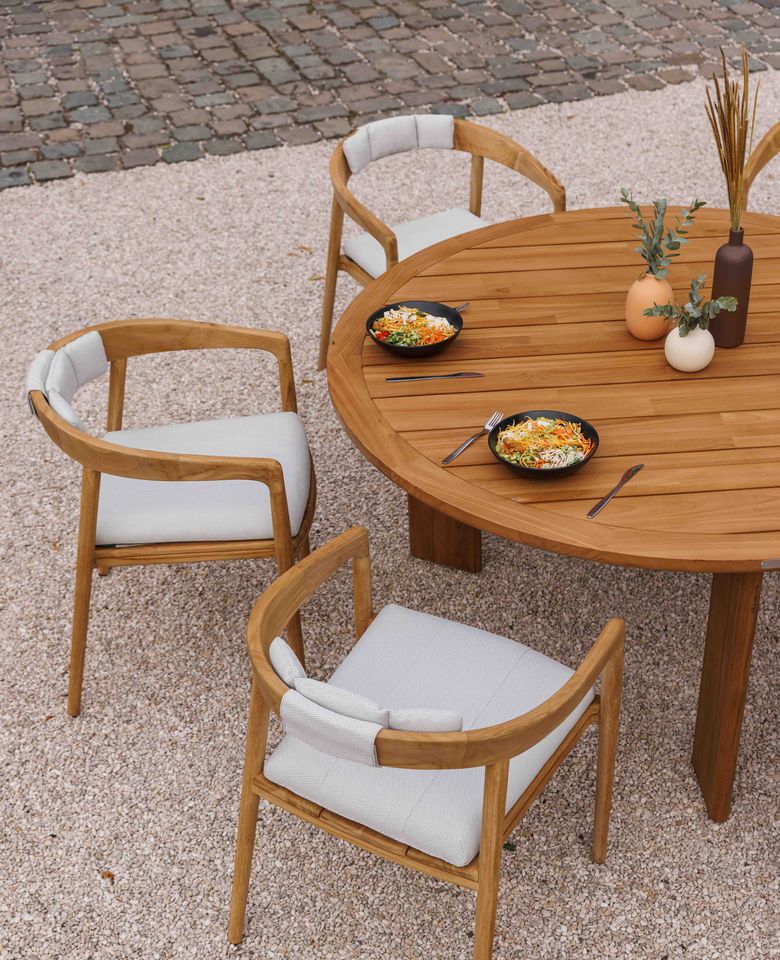 De eethoek buiten wordt dit jaar het middelpunt van de gezelligheid. Ronde tafels zijn de ideale oplossing voor zowel grote als kleine terrassen. De teakhouten Andalucia tafel brengt een warme, natuurlijke sfeer met zijn prachtige houtnerf. Voor wie houdt van een moderne, luxe uitstraling is er de Oslo met een keramisch blad – oersterk en stijlvol afgerond.