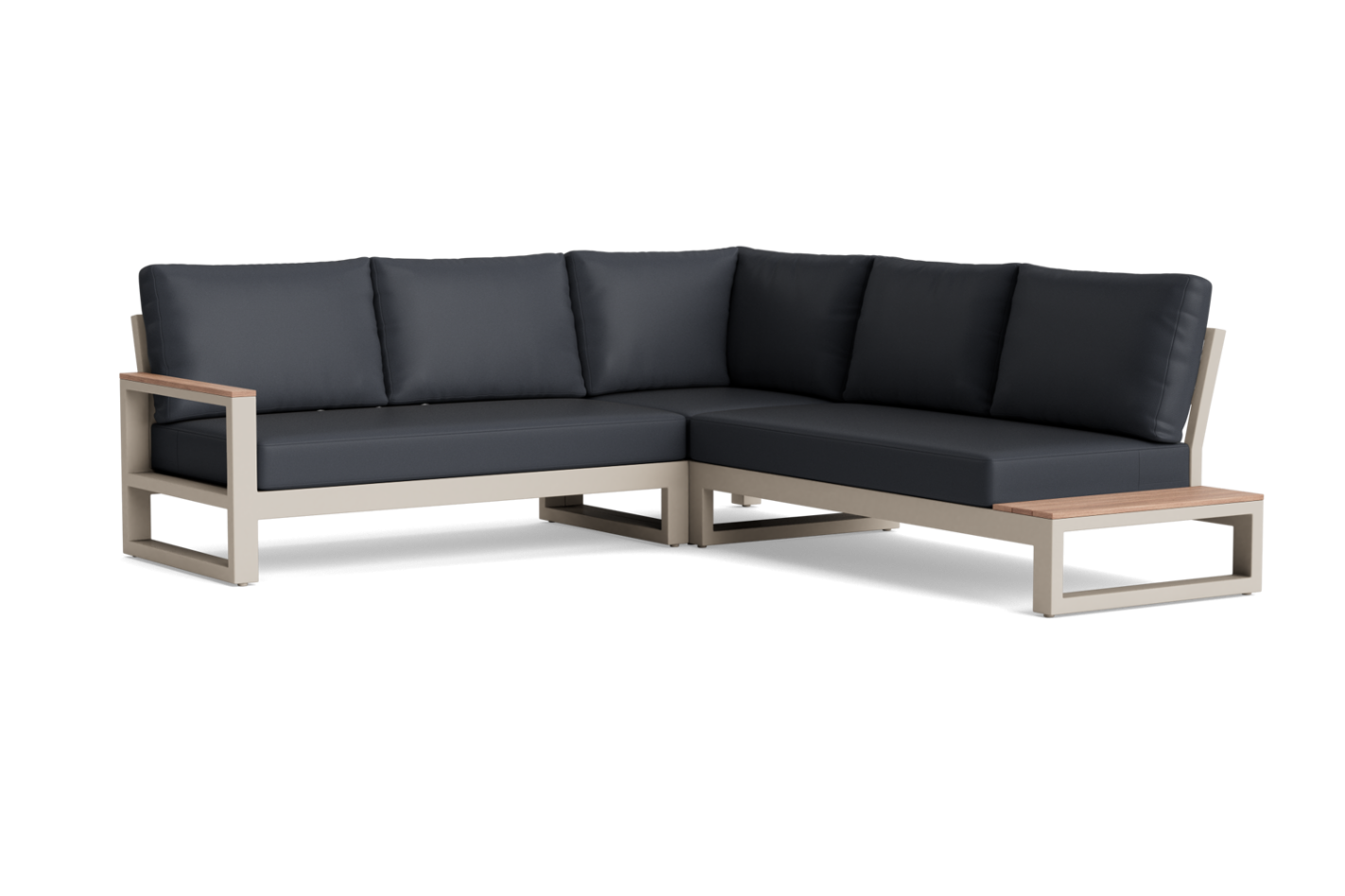 Tijdloze, veelzijdige loungeset. Strakke profielen, diepe zit, keuze uit armleuningen of zijtafels (met teak latten).