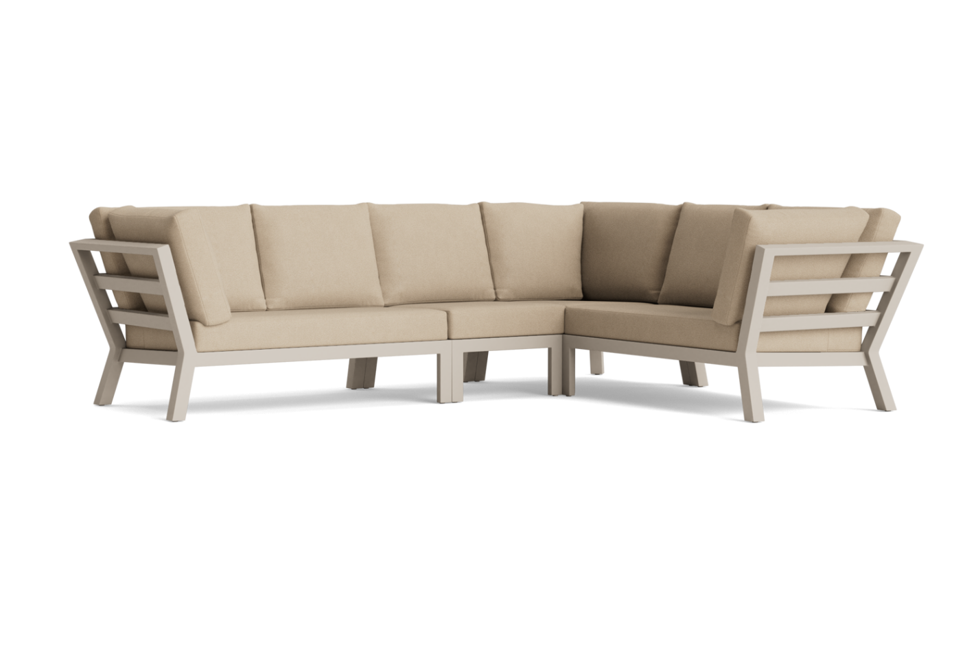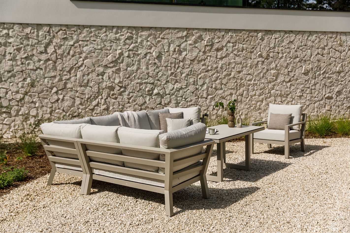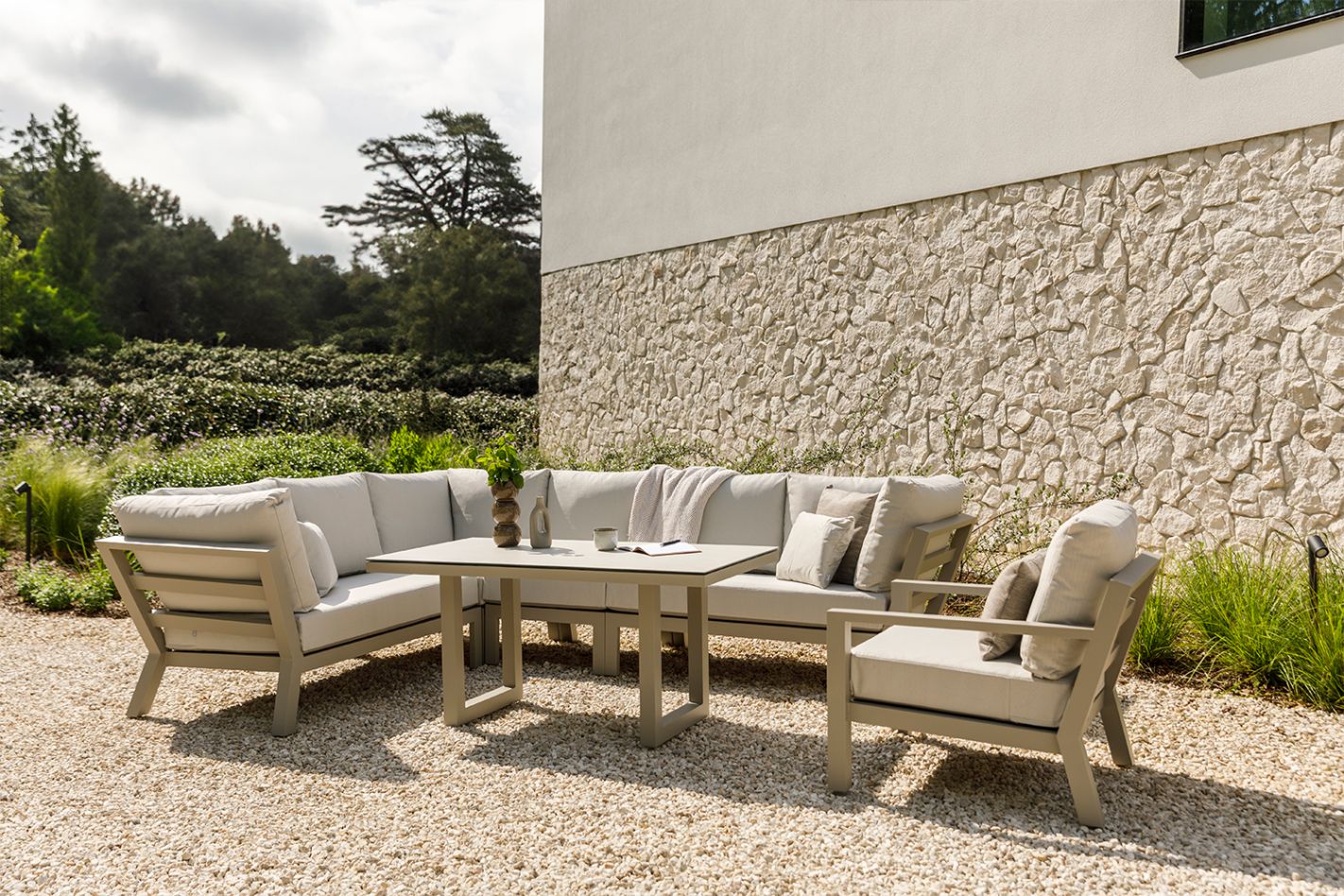 Onder de kussens ligt een zitting die subtiel meeveert en daardoor extra zitcomfort biedt tijdens langere momenten buiten. Het aluminium frame geeft de set een stabiele basis en blijft prettig in dagelijks gebruik. Binnen de Timber serie zijn verschillende elementen beschikbaar — zoals banken, hoekdelen, extensies en poefs — zodat je eenvoudig een opstelling maakt die past bij jouw buitenruimte. De serie biedt daarnaast praktische tafels, waaronder een in hoogte verstelbare variant en handige pull-over tafeltjes.