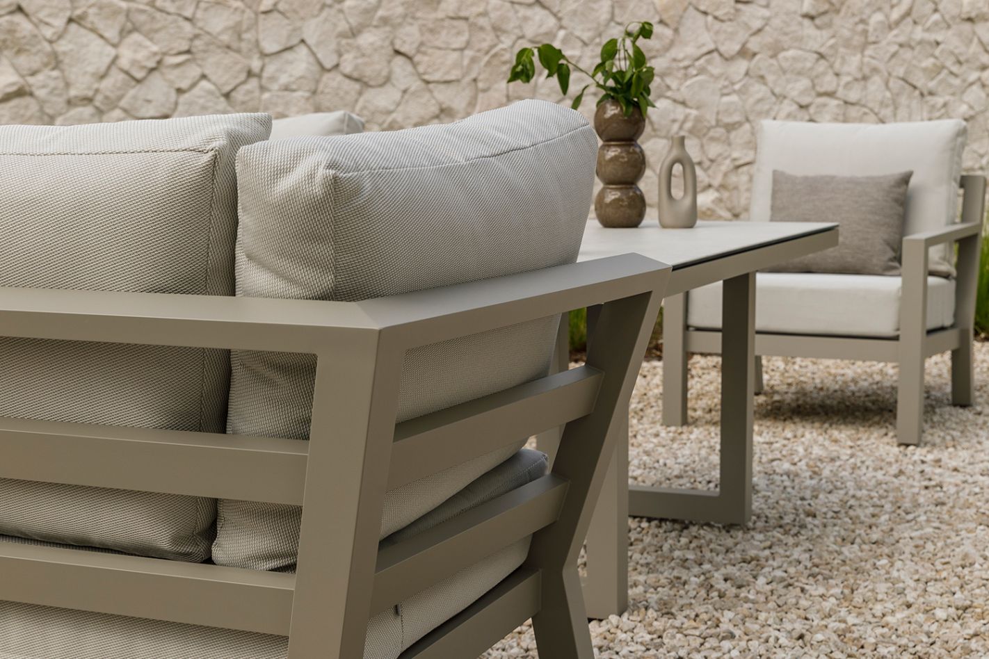 De Timber loungeset brengt een moderne, strakke uitstraling naar je buitenruimte. De vormgeving voelt licht en overzichtelijk aan, waardoor de set moeiteloos past op zowel ruime terrassen als kleinere zithoeken. De zithouding is iets actiever dan bij diepe loungesets, ideaal voor wie graag buiten ontspant maar toch prettig rechtop wil zitten tijdens gesprekken of bij een kop koffie.