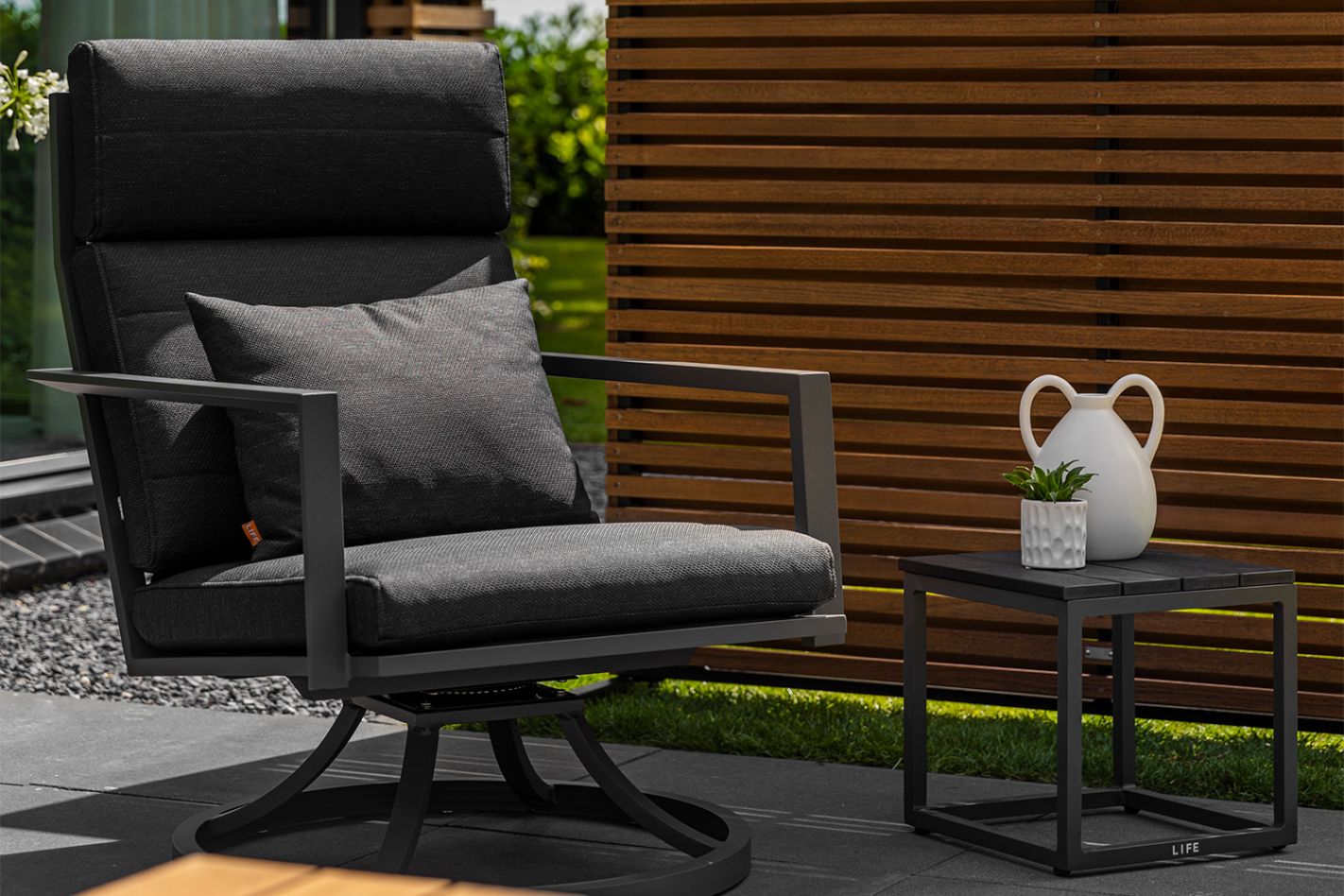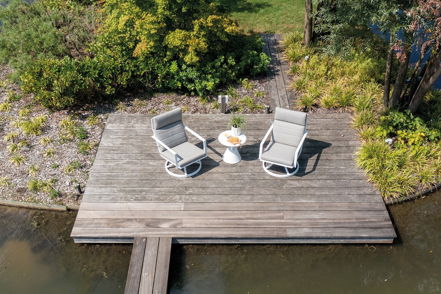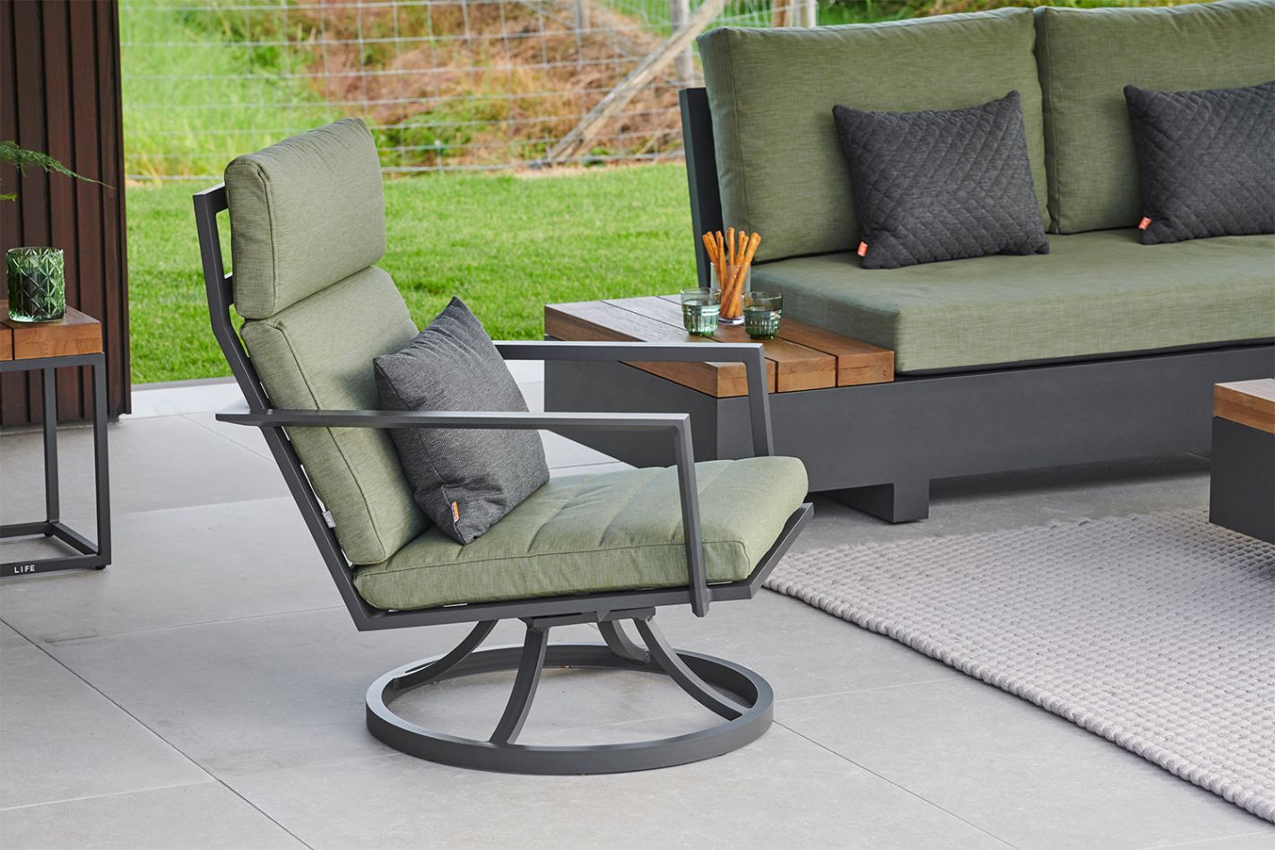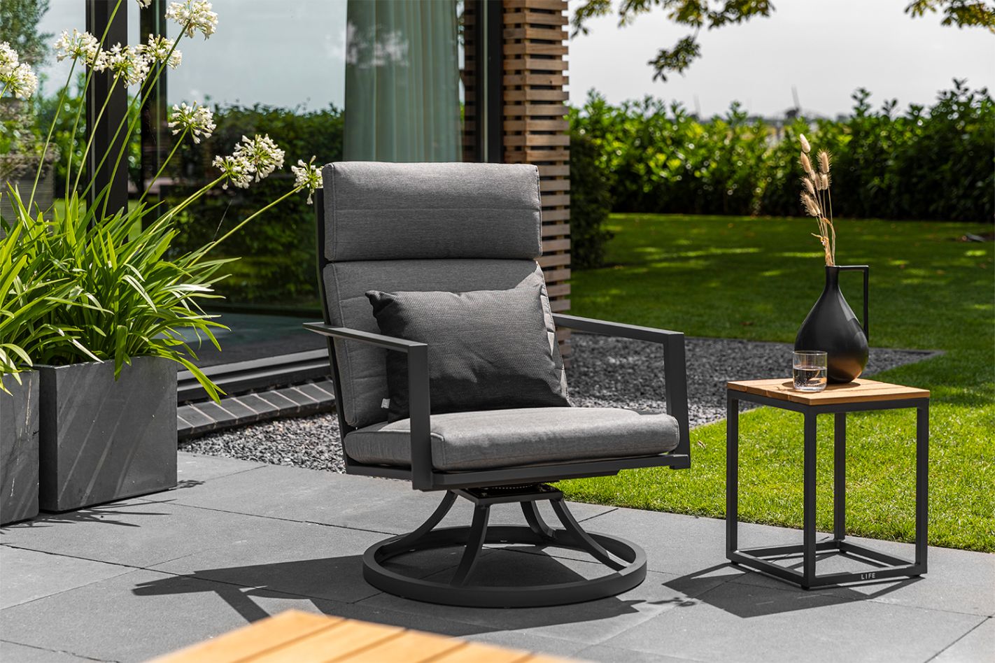 Moderne aluminium relaxstoel met 360 graden draaifunctie. Onderhoudsvrij met subtiele knik in de rug en Bondi kussen.