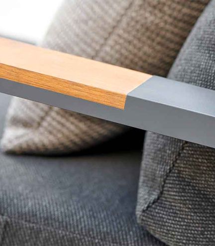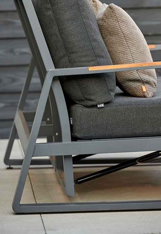 Een actieve, hoge zit die moeiteloos schakelt tussen loungen en dineren. De hoge rugleuning biedt goede ondersteuning, terwijl de dikke kussens zorgen voor een luxe zitervaring. Een sling doek onder het kussen veert licht mee en verhoogt het comfort. De rugleuning is traploos verstelbaar met een soepel werkende gasveer. Het aluminium frame in lava of beige heeft afgeronde hoeken en een herkenbare sledepoot. De teakhouten armleggers zijn stijlvol geïntegreerd in het frame.