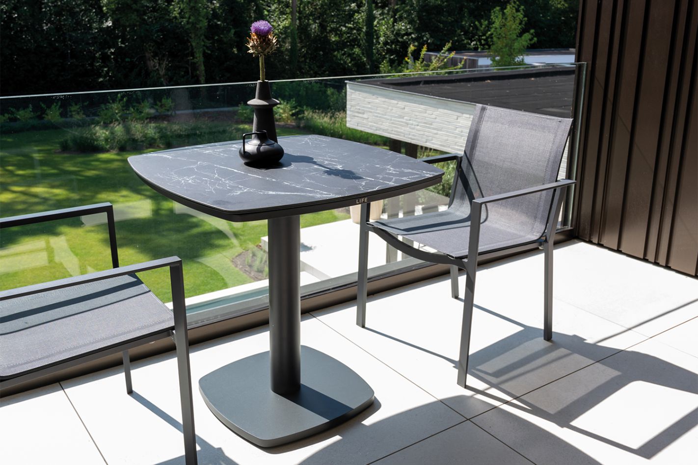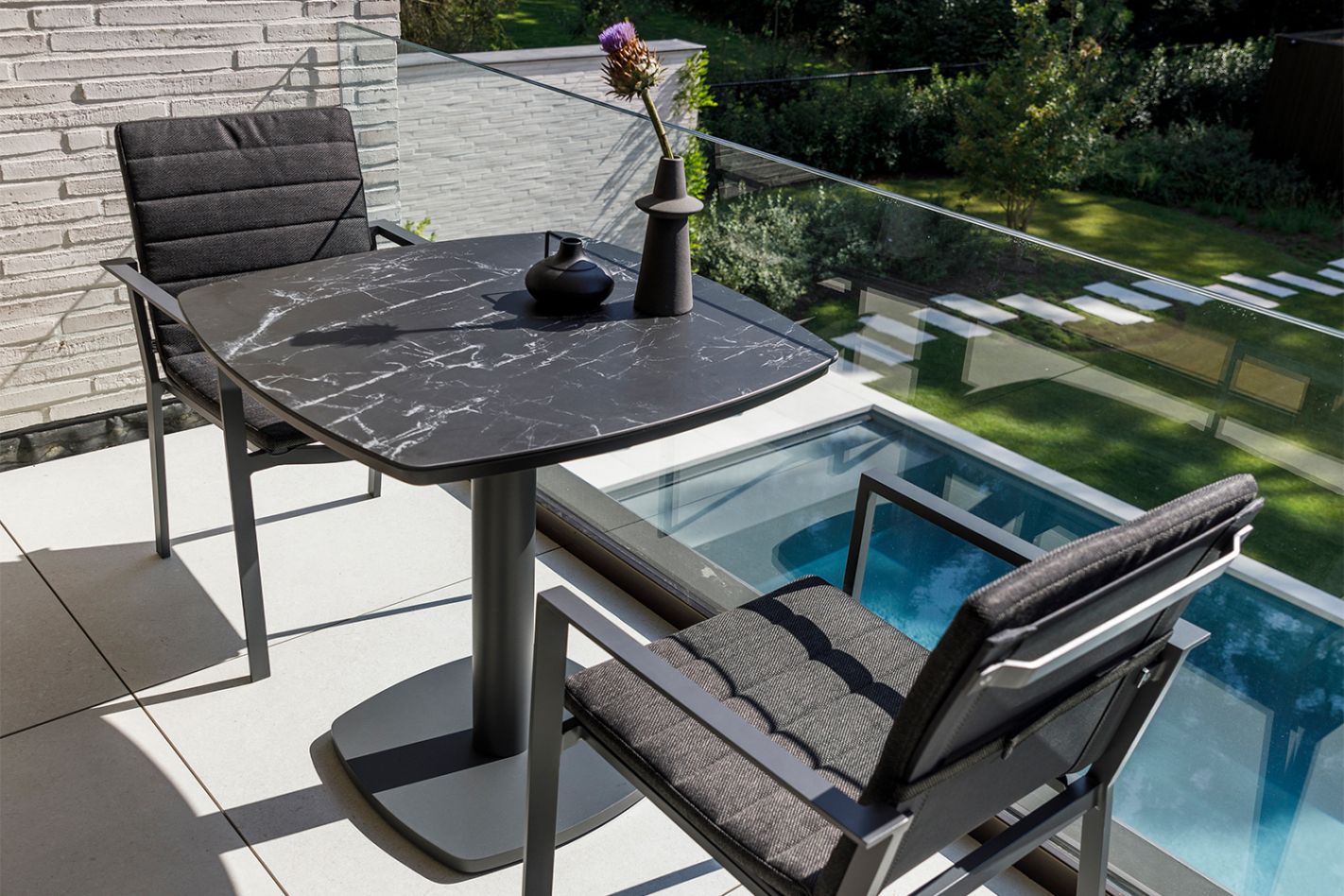 Compacte bistrotafel (70x70 cm) met organische vormen. Aluminium frame en duurzaam keramisch blad.